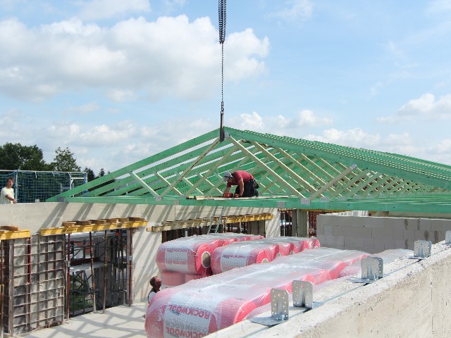 Die Dachkonstruktion wurde aus Brettschichtholzbindern und Koppelpfetten hergestellt. Die Dacheindeckung besteht aus isoliertem Dachblech.