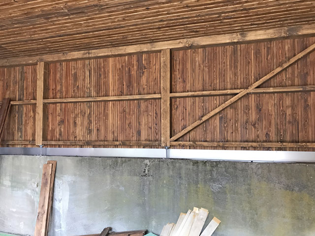Die Wandkonstruktion besteht aus Stahlstützen und Holzwandriegel. Sie wurde verkleidet mit isoliertem Wandblech.